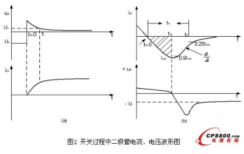 開關(guān)管工作在硬開關(guān)條件下開關(guān)電源自身產(chǎn)生電磁干擾的根本原因,就是在其工作過程中的開關(guān)管的高速開關(guān)及整流二極管的反向恢復(fù)產(chǎn)生高di/dt和高dv/dt,它們產(chǎn)生的浪涌電流和尖峰電壓形成了干擾源。開關(guān)管工作在硬開關(guān)時(shí)還會(huì)產(chǎn)生高di/dt和高dv/dt,從而產(chǎn)生大的電磁干擾。圖1繪出了接感性負(fù)載時(shí),開關(guān)管工作在硬開關(guān)條件下的開關(guān)管的開關(guān)軌跡,圖中虛線為雙極性晶體管的安全工作區(qū),如果不改善開關(guān)管的開關(guān)條件,其開關(guān)軌跡很可能會(huì)超出安全工作區(qū),導(dǎo)致開關(guān)管的損壞。由于開關(guān)管的高速開關(guān),使得開關(guān)電源中的高頻變壓器或儲(chǔ)能電感等感性負(fù)載在開關(guān)管導(dǎo)通的瞬間,迫使變壓器的初級(jí)出現(xiàn)很大的浪涌電流,將造成尖峰電壓。開關(guān)管在截止期間,高頻變壓器繞組的漏感引起的電流突變,從而產(chǎn)生反電勢(shì)E=-Ldi/dt,其值與電流變化率(di/dt)成正比,與漏感量成正比,疊加在關(guān)斷電壓上形成關(guān)斷電壓尖峰,從而形成電磁干擾。此外,開關(guān)管上的反向并聯(lián)二極管的反向恢復(fù)特性不好,或者電壓尖峰吸收電路的參數(shù)選擇不當(dāng)也會(huì)造成電磁干擾。由整流二極管的反向恢復(fù)引起的干擾源有兩個(gè),它們分別是輸入整流二極管和輸出整流二極管。它們都是由電流的換向引起的干擾。由圖2表明,t0=0時(shí)二極管導(dǎo)通,二極管的電流迅速增大,但是其管壓降不是立即下降,而會(huì)出現(xiàn)一個(gè)快速的上沖。其原因是在開通過程中,二極管PN結(jié)的長(zhǎng)基區(qū)注入足夠的少數(shù)載流子,發(fā)生電導(dǎo)調(diào)制需要一定的時(shí)間tr。該電壓上沖會(huì)導(dǎo)致一個(gè)寬帶的電磁噪聲。而在關(guān)斷時(shí),存在于PN結(jié)長(zhǎng)基區(qū)的大量過剩少數(shù)載流子需要一定時(shí)間恢復(fù)到平衡狀態(tài)從而導(dǎo)致很大的反向恢復(fù)電流。當(dāng)t=t1時(shí),PN結(jié)開始反向恢復(fù),在t1-t2時(shí)間內(nèi),其他過剩載流子依靠復(fù)合中心復(fù)合,回到平衡狀態(tài)。這時(shí)管壓降又出現(xiàn)一個(gè)負(fù)尖刺。通常t2《t1,所以該尖峰是一個(gè)非常窄的尖脈沖,產(chǎn)生的電磁噪聲比開通時(shí)還要強(qiáng)。因此,整流二極管的反向恢復(fù)干擾也是開關(guān)電源中的一個(gè)重要干擾源。