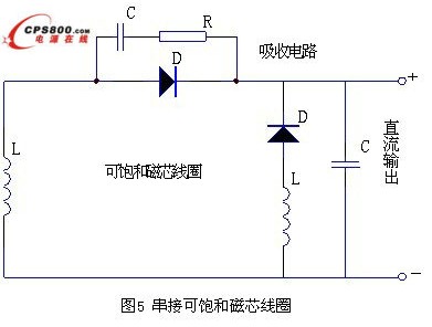 二次整流回路中,與整流二極管D串接可飽和磁芯的線圈,如圖5所示??娠柡痛判揪€圈在通過正常電流時(shí)磁芯飽和,電感量很小,不會(huì)影響電路正常上作。一旦電流要反向時(shí),磁芯線圈將產(chǎn)生很大的反電動(dòng)勢(shì),阻止反向電流的上升。因此,將它與二極管D串聯(lián)就能有效地抑制二極管D的反向浪涌電流。