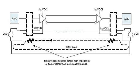 如圖4所示,通過相對于其他電路組件而言的高阻抗,隔離中斷了由電路通路形成的環(huán)路。通過中斷該環(huán)路,噪聲電壓出現(xiàn)在隔離層上,而非出現(xiàn)在接收機(jī)或更為敏感的組件上。噪聲電壓的高電平可以由外部電流或電壓源(例如:電感馬達(dá)和閃電(lightning))耦合。[page]