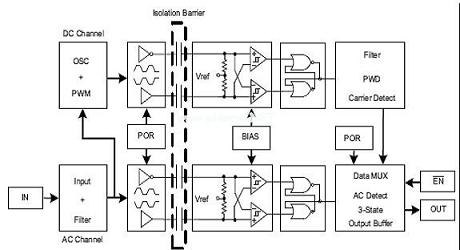 在允許通過電磁或光鏈路進(jìn)行模擬或數(shù)字信號傳輸?shù)耐瑫r(shí),電路隔離器阻礙了各電路之間的低頻電流。數(shù)字隔離器傳輸二進(jìn)制信號,模擬隔離器則在隔離層上傳輸連續(xù)信號。在模擬和數(shù)字隔離器中,工作和峰值額定電壓以及共模瞬態(tài)抗擾度均為這種隔離層的重要特性。當(dāng)對數(shù)字信號進(jìn)行隔離時(shí),隔離電路的這些重要特性為輸入和輸出邏輯電壓電平、信號速率、數(shù)據(jù)運(yùn)行長度以及自動防護(hù)響應(yīng)。