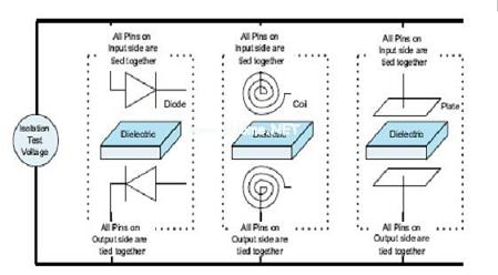 三個(gè)主要標(biāo)準(zhǔn)驗(yàn)證了對于隔離保護(hù)的必要性,其分別為UL1577、IEC60747-5-2和CSA。雖然每一種標(biāo)準(zhǔn)都稍有不同,但是均提供了一個(gè)對比隔離性能的標(biāo)準(zhǔn)。IEC、UL和CSA的測試證實(shí)了輸入和輸出之間電介質(zhì)擊穿以外的電壓。運(yùn)用這些標(biāo)準(zhǔn)非常簡單,因?yàn)闇y試標(biāo)準(zhǔn)和隔離方法無關(guān)。圖10顯示了隔離測試是如何將隔離器看作是兩端器件的。盡管每種器件的物理結(jié)構(gòu)存在差異,但隔離測試卻是在電介質(zhì)擊穿電壓上測定的。