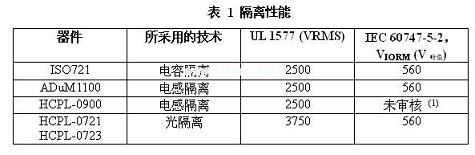 UL1577、IEC60747-5-2、IEC61010-1和CSA測試了ISO72x系列隔離性能。表1顯示了說明該三種隔離技術(shù)的這五個(gè)器件的隔離性能。