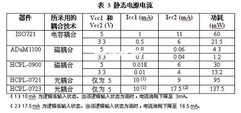 除了隔離層上信號傳輸?shù)男手猓斎牒洼敵稣{(diào)節(jié)電路的設(shè)計(jì)同功耗的相關(guān)性最大。如表3所示,與電感或電容實(shí)例相比,光耦合器的功耗會更高。