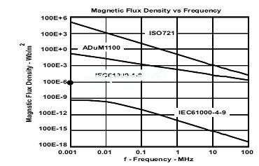 圖12對比了ADuM1100和ISO72x(沒有找到HCPL-0900的數(shù)據(jù))的磁場抗擾度。相對來說盡管這兩個(gè)實(shí)例均對磁場有一定的抗擾度,但是ISO72x提供了更大的裕度。如前面所述,光耦合隔離層電路對外部磁場具有內(nèi)在的磁化抗擾度。