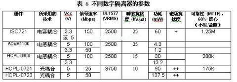 噪聲降低和噪聲保護(hù)使得隔離器在那些隔離器中斷接地環(huán)路并將接地電壓差隔離的電子電路中得到廣泛使用。設(shè)計(jì)人員現(xiàn)在擁有許多用來進(jìn)行數(shù)字信號隔離的選擇,包括TI推出的ISO72x系列,其在信號速率、電介質(zhì)擊穿電壓、瞬態(tài)抗擾度、功耗、磁場抗擾度以及可靠性等重要特性方面均表現(xiàn)不俗。表6對本報(bào)告中所討論實(shí)例的這些特性進(jìn)行了總結(jié)。