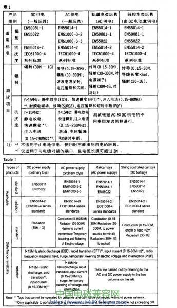 表1不包括以無線電發(fā)射接收為主要功能的玩具(如遙控車、對講機等).歐洲對該類產(chǎn)品有專用標準要求,在此就不另行介紹。