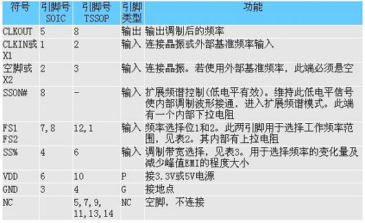 在擴(kuò)展頻譜時(shí)鐘發(fā)生中,EMI減弱要依靠整形、調(diào)制率和調(diào)制波形的頻率。當(dāng)整形及調(diào)制波形的頻率由已定的頻率來(lái)確定時(shí),調(diào)制的百分比就會(huì)有所不同。使用頻率選擇位(FS1及FS2)能設(shè)置頻率范圍。擴(kuò)展率也被設(shè)到-1.25%之間。見(jiàn)表2。高擴(kuò)展率加強(qiáng)了對(duì)EMI的減弱,然而,高擴(kuò)展率卻可能會(huì)因?yàn)槌^(guò)系統(tǒng)最大額定頻率或低于平均頻率而使性能受到影響。鑒于上述原因,擴(kuò)展率多在0.5%--2.5%之間。