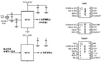 W181-01/02/03有8引腳SOIC封裝及14引腳TSSOP封裝,及其典型應(yīng)用電路框圖和三種封裝管腳排列如圖1所示。
