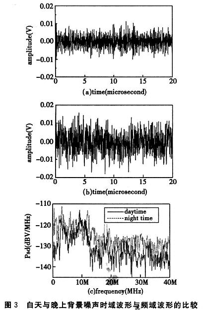 圖3(a)和(b)為在白天和晚上的噪聲時域采樣波形,(c)為白天、晚上噪聲PSD的比較。晚上的有色背景噪聲和窄帶干擾PSD比白天高出約5~15dB。背景噪聲晚上較高的可能原因是晚上用電負(fù)載的增加。