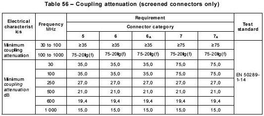 按IEC61196-1測(cè)試同軸電纜的方法,測(cè)試帶屏蔽的平衡電纜,短路8根芯線后用50Ω信號(hào)源激勵(lì)。被測(cè)試線長(zhǎng)1米,測(cè)試頻率30MHz,頻率越高,線長(zhǎng)越短導(dǎo)體表面轉(zhuǎn)移阻抗。主要用于評(píng)估連接硬件的屏蔽效率,其實(shí)測(cè)值不超過(guò)以下計(jì)算值。