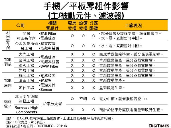 DIGITIMES Research最新報告指出,日本311強(qiáng)震造成日廠手機(jī)/平板相關(guān)零組件供應(yīng)商分別遭受廠房、設(shè)備損壞,亦或海嘯沖擊、地方分區(qū)限電等影響,工廠作業(yè)停擺,影響超過20處工廠,在災(zāi)后截至2011年3月16日仍未能正常作業(yè)。