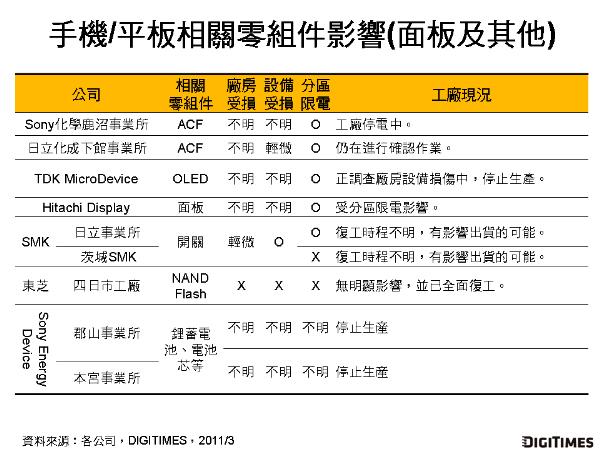 在面板、開關(guān)、存儲器、電池芯、異方性導(dǎo)電膜(ACF)等手機(jī)/平板相關(guān)零組件方面,除東芝位于四日市生產(chǎn)NAND Flash的工廠未受到日本311地震沖擊,其余包含TDK、日立顯示、日立化成、SMK、Sony化學(xué)、Sony Energy Device等業(yè)者的生產(chǎn)工廠,分別受到廠房、設(shè)備受損或停止生產(chǎn)的大小不等的影響。
