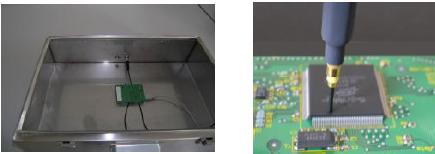 表面掃描法通過測(cè)量集成電路表面電場(chǎng)和磁場(chǎng)的方法來(lái)描述集成電路的電磁發(fā)射特性。該方法的測(cè)量頻率范圍可達(dá)10MHz—3GHz,測(cè)量采用電場(chǎng)探頭或磁場(chǎng)探頭按一定順序掃過集成電路表面,由接收機(jī)將相應(yīng)的測(cè)量結(jié)果依次傳送給計(jì)算機(jī)處理。測(cè)試結(jié)果的準(zhǔn)確性與電場(chǎng)或磁場(chǎng)探頭的特性和探頭定位裝置的精度有關(guān)。該方法可用于探測(cè)集成電路芯片上不同部位的電磁發(fā)射分布情況,適用于對(duì)集成電路的不同設(shè)計(jì)方案的電磁發(fā)射特性的比較。
