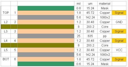 當制作某一特定厚度的印制板時,一方面要求合理地選擇各種材料的參數,另一方面,半固化片最終成型厚度也會比初始厚度小一些。下面是一個典型的6層板疊層結構: