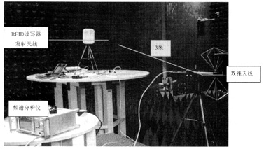 我們針對(duì)UHF頻段的相關(guān)已存在的業(yè)務(wù)進(jìn)行了RFID設(shè)備的兼容性測(cè)試(RFID讀寫(xiě)器樣品帶外雜散發(fā)射測(cè)試圖樣例見(jiàn)圖2),由于標(biāo)簽相對(duì)讀寫(xiě)器來(lái)說(shuō)功率較小,測(cè)試主要考慮讀寫(xiě)器對(duì)公眾蜂窩通信的影響,特別是對(duì)易發(fā)生鄰頻干擾的GSM網(wǎng)絡(luò)。對(duì)無(wú)中心對(duì)講機(jī)系統(tǒng)也進(jìn)行了相關(guān)的實(shí)驗(yàn)室環(huán)境干擾測(cè)試。我們所使用的測(cè)試環(huán)境為EMC10米法半電波暗室、5米法全電波暗室,以及相關(guān)的真實(shí)環(huán)境。實(shí)驗(yàn)室測(cè)試配置如圖3所示。
