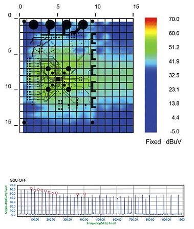 該公司期望用令人信服的量化證據(jù)來(lái)向汽車(chē)廠商說(shuō)明SSCG功能可以有效降低EMI輻射。為了實(shí)現(xiàn)這個(gè)目標(biāo),設(shè)計(jì)團(tuán)隊(duì)首先在SSCG功能為“關(guān)”的情況下將待測(cè)器件(DUT)放其內(nèi)部掃描儀上,加電,然后在PC中捕獲輻射特性。為了進(jìn)行有效的對(duì)比,在打開(kāi)SSCG功能的情況下,對(duì)同一待測(cè)器件進(jìn)行了掃描。