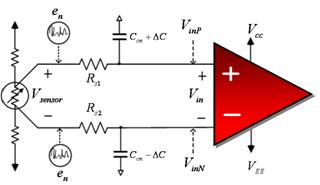 這種方法存在的問題是現(xiàn)貨電容都有一個 5% 到 10% 的典型容差,這就是說如果每條支線的 CCM 反向不匹配,總差動容差便會高達 20%。圖 3 更好地表示了這種電容不匹配,同時還顯示了電阻傳感器輸出端的共模噪聲輸入 (eN) 情況。
