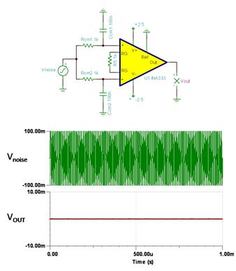 共模濾波器電容 (Ccm) 完全匹配時,噪聲幾乎被徹底消除。圖 2 顯示了 TINA SPICE 仿真的這一結(jié)果,其將一個 100 mVpp、100 kHz 的共模誤差信號注入到 INA333 輸入端。