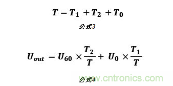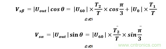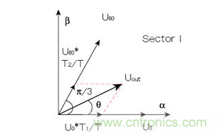 由8個基本電壓空間矢量可以合成任意定子電壓矢量。如圖4所示,以U0, U60扇區(qū)為例,若在一個PWM周期T內(nèi),同時輸出T1時間U0矢量和T2時間的U60矢量,則由矢量(T1/T)U0,(T2/T)U60可以合成給定的參考電壓矢量Uout。