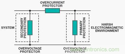 圖5顯示一個(gè)典型保護(hù)方案,其特征是具有兩重保護(hù):主保護(hù)和次級(jí)保護(hù)。主保護(hù)可將大部分瞬變能量從系統(tǒng)轉(zhuǎn)移開(kāi),通常位于系統(tǒng)和環(huán)境之間的接口。它旨在將瞬變分流至地,從而消除大部分能量。