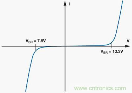 重要的是要確保TVS的擊穿電壓在受保護(hù)引腳的正常工作范圍之外。CDSOT23-SM712的獨(dú)有特性是具有+13.3 V和–7.5 V的非對(duì)稱擊穿電壓,與+12 V至–7 V的收發(fā)器共模范圍相匹配,從而提供最佳保護(hù),同時(shí)最大程度減小對(duì)ADM3485E RS-485收發(fā)器的過(guò)壓應(yīng)力。