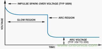 圖9顯示GDT的典型特性。當(dāng)GDT兩端的電壓增大時(shí),放電管中的氣體由于產(chǎn)生的電荷開(kāi)始電離。這稱為輝光區(qū)。在此區(qū)域中,增加的電流將產(chǎn)生雪崩效應(yīng),將GDT轉(zhuǎn)換為虛擬短路,允許電流通過(guò)器件。在短路事件中,器件兩端產(chǎn)生的電壓稱為弧電壓。輝光區(qū)和電弧區(qū)之間的轉(zhuǎn)換時(shí)間主要取決于器件的物理特性。
