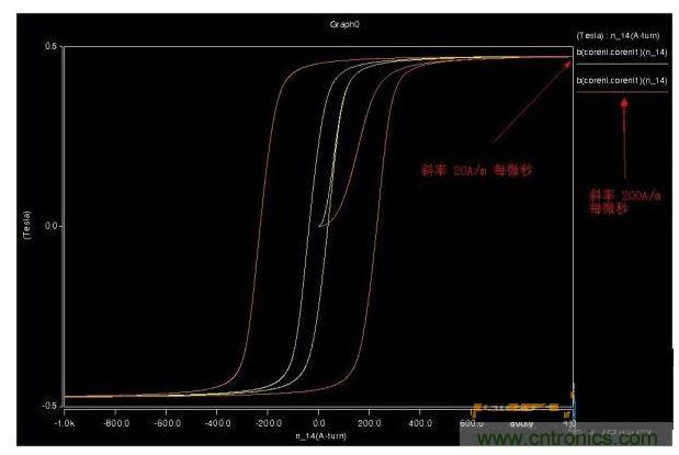 用三角波仿真了下磁芯,磁滯回線方正了很多,也不會因?yàn)檎乙?guī)律產(chǎn)生嚴(yán)重的拖尾效應(yīng)。圖2是同頻率不同幅度。圖3同斜率不同幅度的。