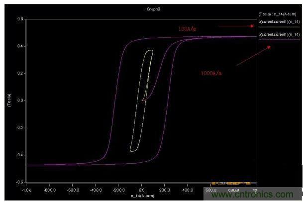 2、仿真CCM模式,磁滯回線上會出現(xiàn)兩個安匝跳變位置,但是磁通密度并不能跳變,而是通過下降來釋放能量。
