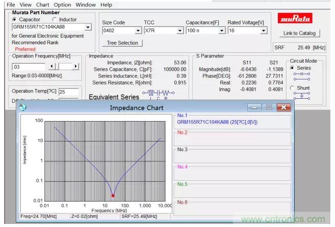 平常對(duì)ESR的關(guān)注不多,其實(shí)ESR也是非常關(guān)鍵的一個(gè)參數(shù)。不少人對(duì)ESR會(huì)有一些誤解。首先,ESR不是一個(gè)常數(shù),是隨著頻率而變化的。圖1的Murata