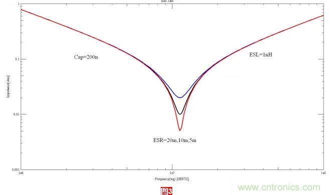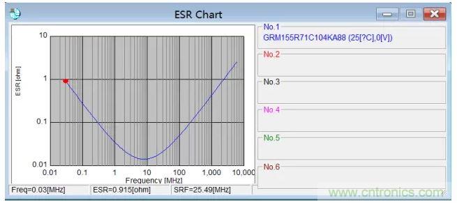 工具里面看到的串聯(lián)電阻(Series Resistance )值,不是我們常規(guī)理解的諧振頻率點(diǎn)的ESR,后面的等效電路仿真的時(shí)候需要注意這個(gè)細(xì)節(jié)。圖2是這個(gè)電容的ESR隨頻率變化的曲線。諧振頻率點(diǎn)的ESR值,決定了電容阻抗曲線的最低點(diǎn)。這個(gè)值在電容設(shè)計(jì)的時(shí)候也非常重要,一般來(lái)說(shuō),小尺寸封裝的小電容,諧振頻率點(diǎn)的ESR值一般較大。