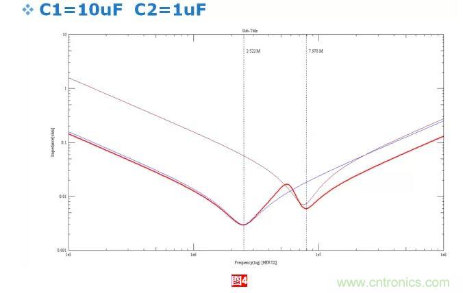 不同種類(lèi)電容的并聯(lián)如圖4所示,兩種電容并聯(lián),會(huì)出現(xiàn)兩個(gè)諧振頻率點(diǎn)。同時(shí)還會(huì)出現(xiàn)一個(gè)反諧振頻率點(diǎn),這個(gè)反諧振頻率是電容設(shè)計(jì)的難點(diǎn)之一。