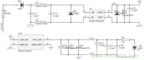 本控制模塊的電源電路如圖2所示。車載蓄電池—發(fā)電機的電源從24V_1處進入,二極管D16主要是防止電源的正負極被誤接反。電感L1、L2對電源進行濾波,和共模電感L3、電容C8配合,可以過濾掉電源中的尖峰脈沖。二極管D24 P6KE51A是脈沖干擾抑制器(TVS),它可以快速吸收超過額定電壓的尖峰脈沖,瞬時通過電流很大,最大功率可達500~1000W。電容E5和C9進一步對電源進行濾波。過濾干凈的電流通過開關電源芯片LM2576變換為系統(tǒng)使用的5V電源。電容E7和C11對輸出5V電源進行濾波,電阻R18和發(fā)光二極管D28指示當前是否有電。