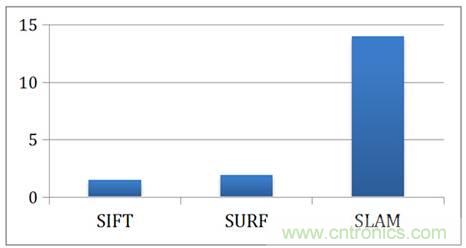 圖6展示了FPGA相對CPU在執(zhí)行SIFT、SURF以及SLAM算法的節(jié)能比。使用FPGA后,SIFT與SURF分別取得了1.5倍與1.9倍的節(jié)能比,而SLAM的算法取得了14倍的節(jié)能比。根據(jù)我們的經(jīng)驗,如果機器人將手機電池用于一個多核的Mobile CPU去跑這一套感知算法,電池將會在40分鐘左右耗光。但是如果使用FPGA進行計算,手機電池就足以支撐6小時以上,即可以達到10倍左右的總體節(jié)能 (因為SLAM的計算量比特征提取高很多)。