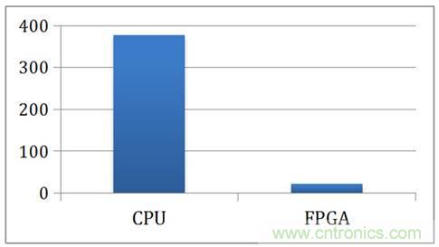 為了讓讀者了解FPGA對深度學(xué)習(xí)的加速以及節(jié)能,我們下面關(guān)注北京大學(xué)與加州大學(xué)的一個關(guān)于FPGA加速CNN算法的合作研究。圖7展示了FPGA與CPU在執(zhí)行CNN時的耗時對比。在運行一次迭代時,使用CPU耗時375毫秒,而使用FPGA只耗時21毫秒,取得了18倍左右的加速比。假設(shè)如果這個CNN運算是有實時要求,比如需要跟上相機幀率(33毫秒/幀),那么CPU就不可以達到計算要求,但是通過FPGA加速后,CNN計算就可以跟上相機幀率,對每一幀進行分析。