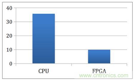 為了讓讀者對FPGA加速有更好的了解,我們總結(jié)了微軟研究院2010年對BLAS算法的FPGA加速研究。BLAS是矩陣運算的底層庫,被廣泛運用到高性能計算、機器學(xué)習(xí)等領(lǐng)域。在這個研究中,微軟的研究人員分析了CPU、GPU以及FPGA對BLAS的加速以及能耗。圖2對比了FPGA以及CPU、GPU執(zhí)行GaxPy算法每次迭代的時間,相對于CPU,GPU與FPGA都達到了60%的加速。圖中顯示的是小矩陣運算,隨著矩陣的增大,GPU與FPGA相對與CPU的加速比會越來越明顯。