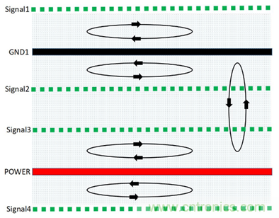(1)由于信號層與回流參考平面相鄰,S1、S2、S3相鄰地平面,有最佳的磁通抵消效果,優(yōu)選布線層S2,其次S3、S1。