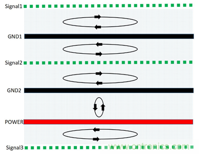 根據(jù)麥克斯韋方程,分立的帶電體或電流,它們之間的一切電的及磁的作用都是通過它們之間的中間區(qū)域傳遞的,不論中間區(qū)域是真空還是實體物質(zhì)。在PCB中磁通總是在傳輸線中傳播的,如果射頻回流路徑平行靠近其相應(yīng)的信號路徑,則回流路徑上的磁通與信號路徑上的磁通是方向相反的,這時它們相互疊加,則得到了通量對消的效果。