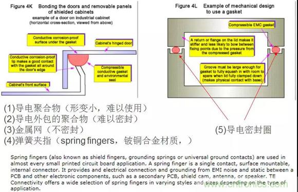 要達(dá)到40dB的SE,通常需要用導(dǎo)體墊圈、彈簧夾指來(lái)進(jìn)行密封,注意內(nèi)部元件與屏蔽罩的間距、數(shù)據(jù)總線與開(kāi)孔和縫隙之間的距離。