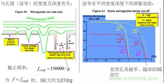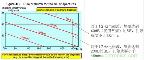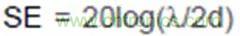 在一個(gè)完美的屏蔽殼體上開(kāi)一個(gè)洞,相當(dāng)于構(gòu)成一個(gè)半波共振縫隙天線,屏蔽效能SE與孔的最大尺寸d、電磁波波長(zhǎng)λ關(guān)系如下: