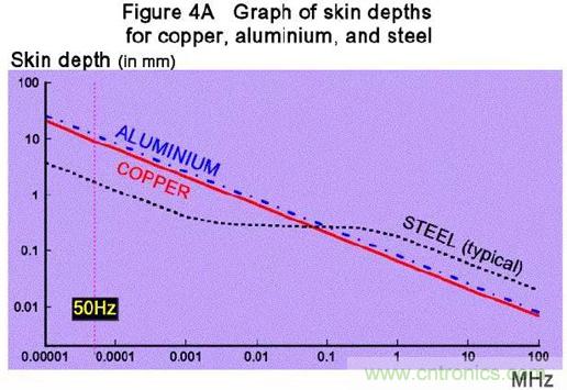 上圖:不同頻率下三種金屬的趨膚效應(yīng)深度(頻率越高,深度越淺,越趨膚);趨膚效應(yīng)以傳導(dǎo)的角度看,是希望趨膚深度深的,那表示導(dǎo)線的利用率高;但是對(duì)于屏蔽,是希望趨膚深度淺的,這樣就能以較薄的金屬屏蔽更多的電磁頻段;50Hz的趨膚深度5~15mm,很難屏蔽……