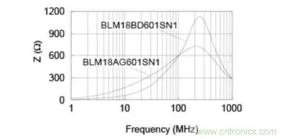 下圖顯示了曲線變化的示例。BLM18AG601SN1和BLM18BD601SN1都是片狀鐵氧體磁珠,在100 MHz時(shí)阻抗值為600Ω,但BLM18BD601SN1具有更尖銳的阻抗曲線,而BLM18AG601SN1的曲線上升更為平緩。