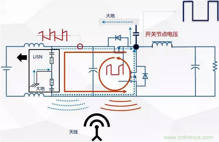 如圖4所示是Buck開(kāi)關(guān)電源的噪聲產(chǎn)生和耦合路徑,從傳導(dǎo)路徑來(lái)說(shuō)開(kāi)關(guān)節(jié)點(diǎn)產(chǎn)生的差模干擾通過(guò)輸入電容濾波后會(huì)直接傳到輸入端,共模干擾通過(guò)開(kāi)關(guān)節(jié)點(diǎn)對(duì)地的耦合再通過(guò)LISN端檢測(cè)到。從輻射的路徑來(lái)看主要是差模的功率電流回路產(chǎn)生的,當(dāng)然共模干擾也會(huì)產(chǎn)生部分輻射干擾。因此在設(shè)計(jì)電路時(shí)減小功率開(kāi)關(guān)電流回路對(duì)傳導(dǎo)輻射干擾有很大的幫助。