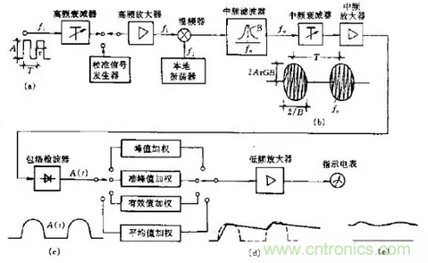 其電路結(jié)構(gòu)類似于半導體收音機。測量時先將測量儀調(diào)諧,對準某個頻率fi。該頻率經(jīng)高頻衰減器和高頻放大器后進人混頻器,與本地振蕩器的頻率fl混頻,產(chǎn)生很多混頻信號。經(jīng)過中頻濾波器以后僅得到中頻f0=fl-fi。中頻信號經(jīng)中頻衰減器、中頻放大器后,由包絡檢波器進行包絡檢波,濾去中頻得到其低頻包絡信號A(t)。A(t)再進一步進行加權(quán)檢波,加權(quán)可根據(jù)需要獲得A(t)的峰值(Peak)、有效值(rms)、平均值(Ave)或準峰值(QP),這些值經(jīng)低頻放大后可推動電表指示。測量前如果用校準信號發(fā)生器的信號進行預先校準, 則可以直接讀數(shù)。騷擾信號的讀數(shù)等效于正弦信號的有效植。