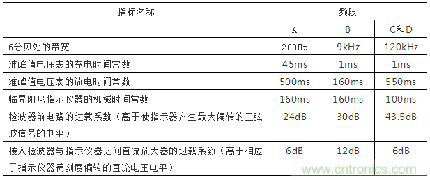 綜上所述,騷擾測量儀必須具有統(tǒng)一的中頻帶寬、檢波器充放電時間常數(shù)、電表機械時間常數(shù)和過載系數(shù),這樣才能保證在測量同一脈沖信號時得到一致的結(jié)果。表2為GB/T6113.1規(guī)定的騷擾測量儀指標。其中各頻率段的范圍為: