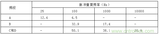 所謂相對脈沖特性指輸人周期性脈沖信號時,脈沖的重復頻率越高,其讀數(shù)越高,重復頻率低,讀數(shù)低。當讀數(shù)不變時輸人脈沖的幅度和重復頻率的關(guān)系應符合表4的規(guī)定。
