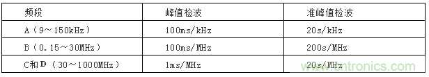 在準峰值測量時,如想要在某個頻率點得到較穩(wěn)定的測量值,則測量時間應大于檢波器充放電時間和電表機械時間常數(shù)之和,并且測量不止一個周期,所以一般準峰值測量時間要求比較長。如果測量儀具有掃頻測量功能,則設置的掃描時間應符合表9的規(guī)定。在實際測量中,往往先用峰值進行全頻段測量,然后再對超過限值的頻率點進行峰值測量,這樣可以大大節(jié)省測量時間。
