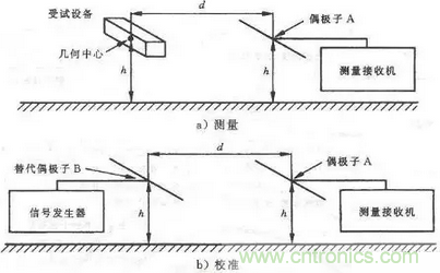 測試距離d雖然沒有明確要求,但最好還應符合遠場條件。d的起始點為EUT的幾何中心,終止點為測量天線A的天線中心。替代試驗和校準試驗時,替代天線B應置于EUT 的幾何中心。