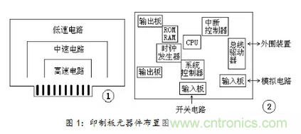 在印制板布置高速、中速和低速邏輯電路時,應(yīng)按照圖1-①的方式排列元器件。