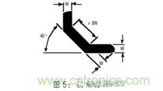 與過孔相似,直角的轉(zhuǎn)彎路徑應(yīng)該被避免,因為它在內(nèi)部的邊緣能產(chǎn)生集中的電場。該場能耦合較強噪聲到相鄰路徑,因此,當(dāng)轉(zhuǎn)動路徑時全部的直角路徑應(yīng)該采用45度。圖5是45度路徑的一般規(guī)則。