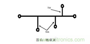 如圖6所示短截線會產(chǎn)生反射,同時也潛在增加輻射天線的可能。雖然短截線長度可能不是任何系統(tǒng)已知信號波長的四分之一整數(shù),但是附帶的輻射可能在短截線上產(chǎn)生振蕩。因此,避免在傳送高頻率和敏感的信號路徑上使用短截線。